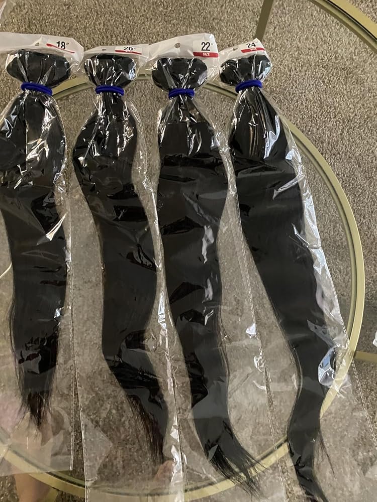 18 20 22 24 inch These human hair bundles are the best, anyone who want a full and natural look this is the hair for u it's silky and soft with the different lengths to fit in your hair perfectly u can comb it out just like your own hair it will never tangle and do different styles with it and also color it how u like it, I would highly recommend this hair to anyone who want the natural look. From the moment I opened the package, I could tell this was high-quality, 100% human hair. I’m absolutely thrilled with the quality! The hair is 100% human, incredibly soft, and blends seamlessly with my natural hair. The hair is incredibly soft, silky, and has a natural shine—no synthetic look or feel whatsoever. The length is 100% accurate (I ordered 20–24 inches, and each bundle measured perfectly), which is rare to find with hair extensions.The hair is thick and full, with minimal shedding even after multiple washes. The density is great—four bundles gave me full, voluminous hair.I’ve worn it for weeks, and it still looks flawless—no tangling, no frizz, and it holds curls beautifully when styled with heat. The texture is smooth and silky, making it easy to style with heat tools. It blends seamlessly with my natural hair, and I’ve gotten countless compliments from friends who thought it was my real hair!What really stands out is the durability. Many hair extensions lose their luster after a few wears, but this hair still looks brand new. The packaging was secure, and shipping was fast. I’ve received so many compliments, and friends keep asking where I got it! I’ve already recommended it to three friends, and they all love it just as much as I do!If you’re looking for affordable, high-quality, long-lasting human hair, this is the one. 10/10 recommend—I’ll definitely be repurchasing!